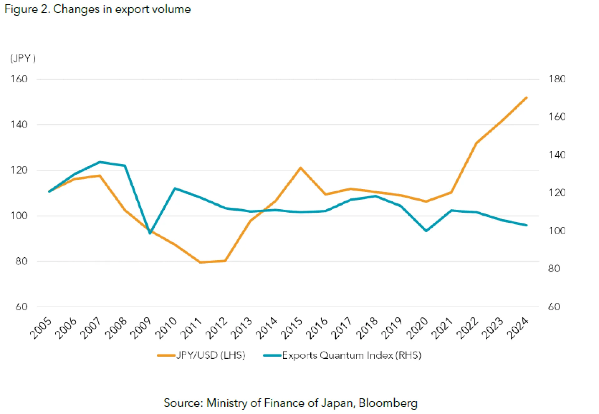 While a correction in yen depreciation offers some benefits to Japanese consumers through stable import prices, it undeniably has a negative impact on the performance of publicly listed companies. A large proportion of Japanese listed companies are internationally competitive, export-oriented multinational corporations, such as those in the automotive sector. This means that the positive effects of yen depreciation have historically had a more pronounced impact on corporate earnings than on the Japanese economy as a whole. However, the positive effects of yen depreciation on exporters have shifted in recent years. As shown in Figure 2, export volumes from Japan have not increased despite the continued weakening of the yen in recent years. This is due to electronics manufacturers shifting production bases to low-wage countries such as China and those in Southeast Asia, and automotive manufacturers increasing local production in consumption-heavy regions like the U.S. Lessons learned from past events such as the Global Financial Crisis (GFC) have led exporters to build business structures more resistant to exchange rate fluctuations. Thus, the current benefits of yen depreciation for exporters are limited to increases in yen-denominated exports and the conversion of overseas subsidiaries' profits into yen.