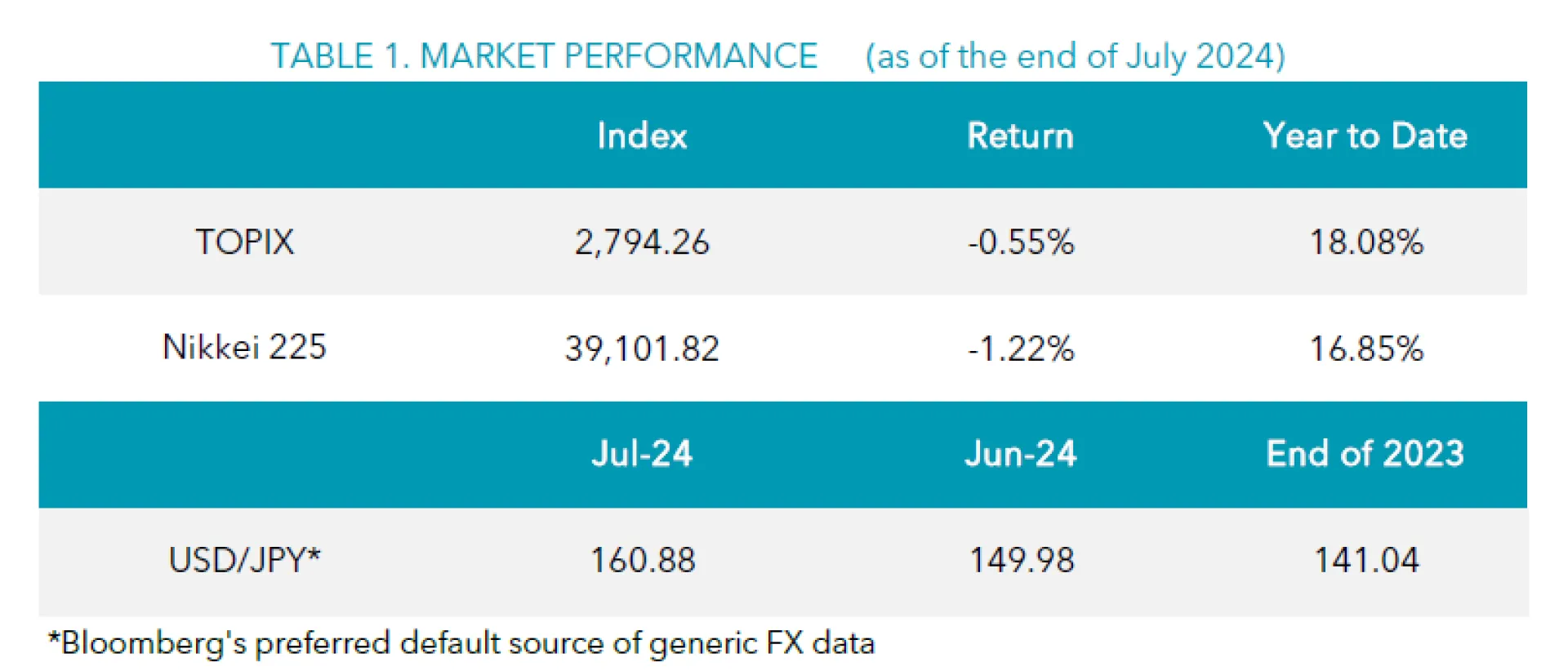 In July, the Japanese equity market saw significant fluctuations. At the start of the month the Nikkei 225 and TOPIX indices reached new historic highs riding the wave of the weak yen and strong US markets but ultimately ended the month in negative territory, dropping by 1.2% and 0.5% respectively. In terms of the TOPIX, downward movement was driven by a drop in the TOPIX 100 large cap index while small caps in the TOPIX Small remained flat and mid caps in the TOPIX Mid400 saw gains. Alongside a tumultuous political and economic environment in the US as the election hots up and US stock indices falling back from historic highs earlier in the month there have also been significant movements in the Japanese economic sphere. The 31st of July saw the Bank of Japan raise its policy rate from 0-0.1% to 0.25%. Following this, the yen surged to the 149 yen to the dollar level, a sharp increase from the 38 year low of 161.7 yen/dollar that was seen at the start of the month.